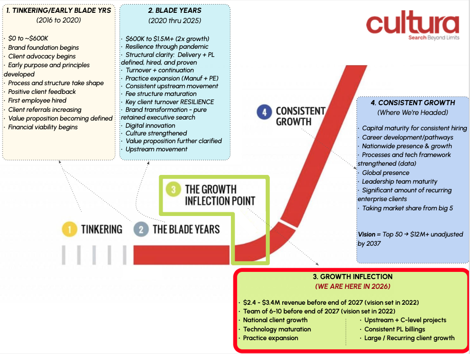 Cultura has experienced impressive growth over the last handful of years, going from an independently run start-up in late 2016 to a ~$2M+ high-touch player and a top 15 Twin Cities based firm in just 10 years. Beginning with a single founder and a purpose-fueled vision, to becoming a reputable firm today with an agile and highly successful team of five, each bringing a diversity of experience and thought to the table, Cultura is entering a pivotal moment of next-stage growth and expansion. In addition to solid revenue growth, the company has made an intentional effort to slowly move "upstream" each year, focused on engaging with larger corporations at a higher level of seniority leading to higher fee and more strategic assignments. Today, Cultura's annual Average Placement Fee sits well into the six figures, and continues to grow steadily, leading to more strategic opportunities and a higher level of credibility within the industry. While Cultura is proud of where it stands today, its team is aspirationally focused on the firm's next 10 years and aims to become a Top 50 Executive Search firm in the US, with a $12M+ revenue target (in today's money) by 2037.